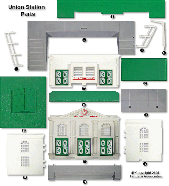 Side Wall Vulnerability The side walls of the Union Station are prone to breakage during assembly and disassembly because of the way that the tabs mount into the front wall. Note the arrow in the picture to the left, where the upper tabs have been broken off. We’ve seen this fault repeatedly. No reproduction of this part available. |